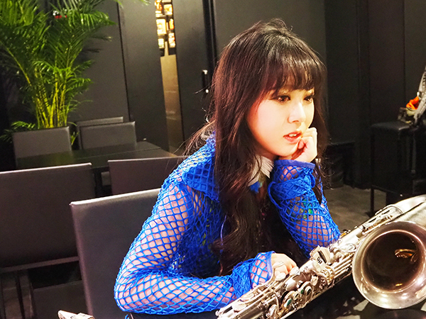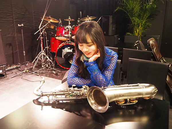 青系が好きで…あと、身長が155cmしか無いんですね。それでテナーサックス持ってる自分とのバランスを見て、身体が大きく見えるように意識して衣装を選んでいます。