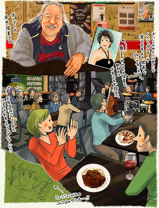 開業以来、穐吉敏子さんのライブが何度か開催されたこともある。今は亡きお兄さんと穐吉さんは、満州の同じ中学校出身。長い間文通されていたことがご縁という。その時のパネルが誇らしげに店内に飾られ、大勢の人であふれかえるお店の写真は早井さんの宝ものだ。